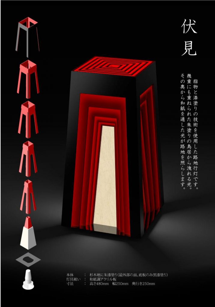 昨年度の第11回「創作行灯デザインコンペ」では、全国から135点の応募をいただき、千本鳥居をモチーフにした作品「伏見」が最優秀作品に選ばれ、東山花灯路で大変好評をいただきました。